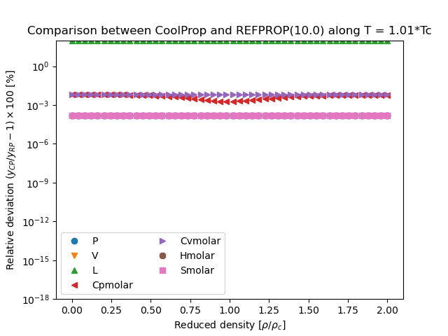 This figure compares the results generated from CoolProp and those generated from REFPROP. They are all results obtained in the form \(Y(T,\rho)\), where \(Y\) is the parameter of interest and which for all EOS is a direct evaluation of the EOS