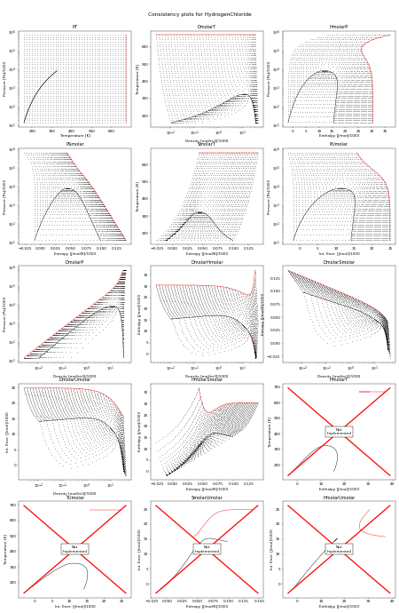 In this figure, we start off with a state point given by T,P and then we calculate each of the other possible output pairs in turn, and then try to re-calculate T,P from the new input pair. If we don’t arrive back at the original T,P values, there is a problem in the flash routine in CoolProp. For more information on how these figures were generated, see CoolProp.Plots.ConsistencyPlots