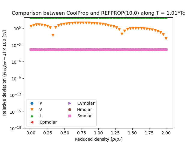 This figure compares the results generated from CoolProp and those generated from REFPROP. They are all results obtained in the form \(Y(T,\rho)\), where \(Y\) is the parameter of interest and which for all EOS is a direct evaluation of the EOS