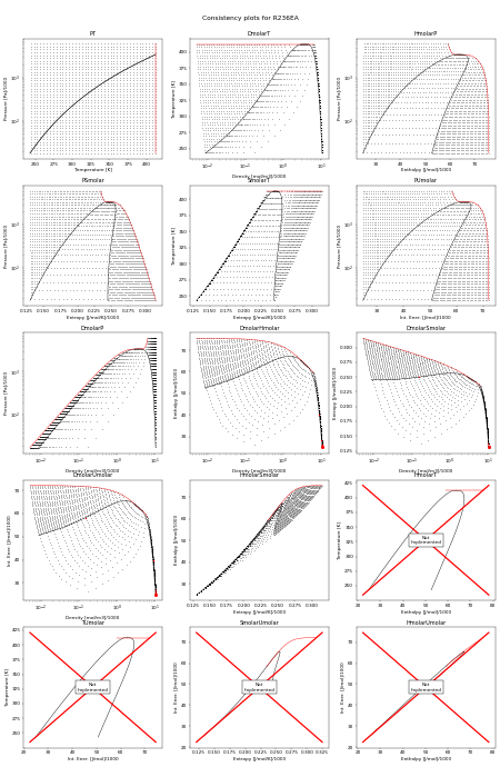 In this figure, we start off with a state point given by T,P and then we calculate each of the other possible output pairs in turn, and then try to re-calculate T,P from the new input pair. If we don’t arrive back at the original T,P values, there is a problem in the flash routine in CoolProp. For more information on how these figures were generated, see CoolProp.Plots.ConsistencyPlots